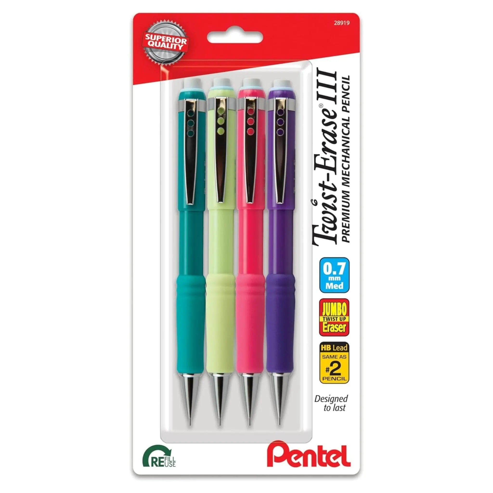 Twist - Erase III Mechanical Pencil, 0.7mm, Assorted Barrel 4 - pk  - Pentel of America, Ltd.