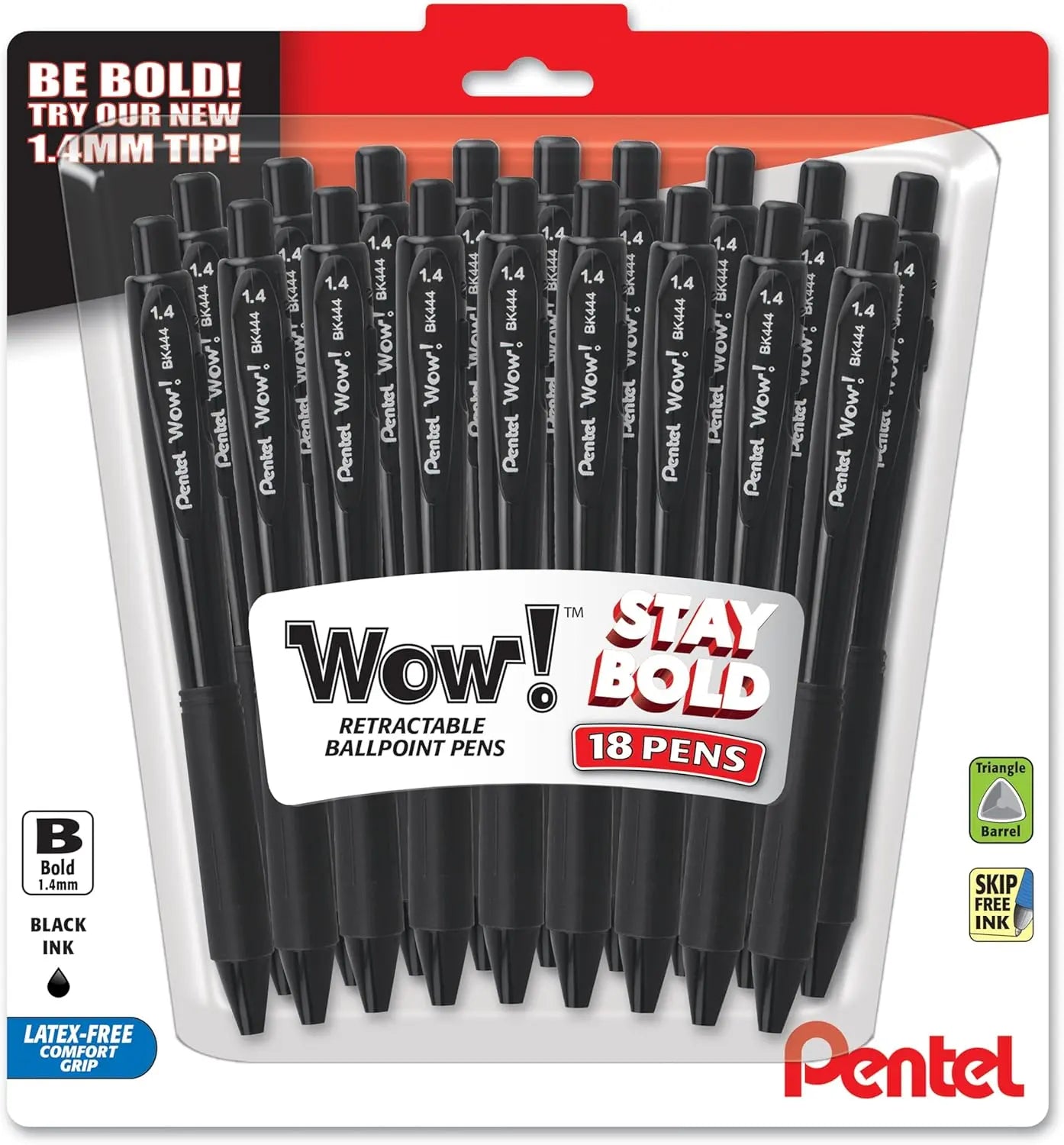 Pentel Wow! Retractable Ballpoint Pen, (1.4mm) Bold Line, Black Ink, 18-pk